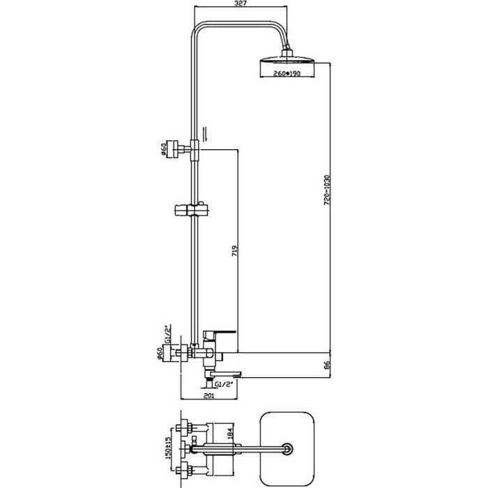 | Комплектация | штанга - 1шт. / верхний душ - 1шт. / ручной душ - 1шт. / смеситель - 1шт. / излив - 1шт. |