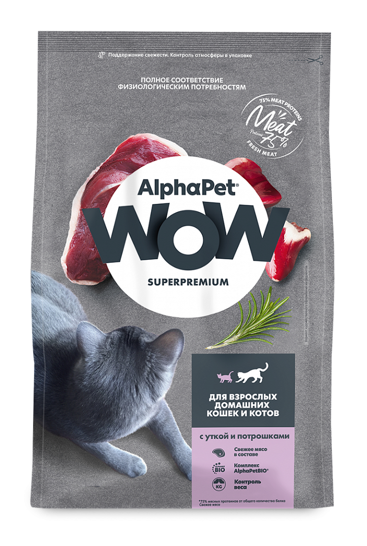 Сухой корм Альфа Пет WOW для взрослых домашних кошек c Уткой и потрошками 750г информация: