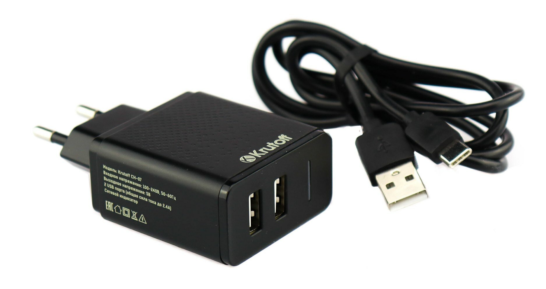 Сетевое ЗУ KRUTOFF CH-07C 2xUSB, 2.4A + кабель USB Type-C (black) информация: