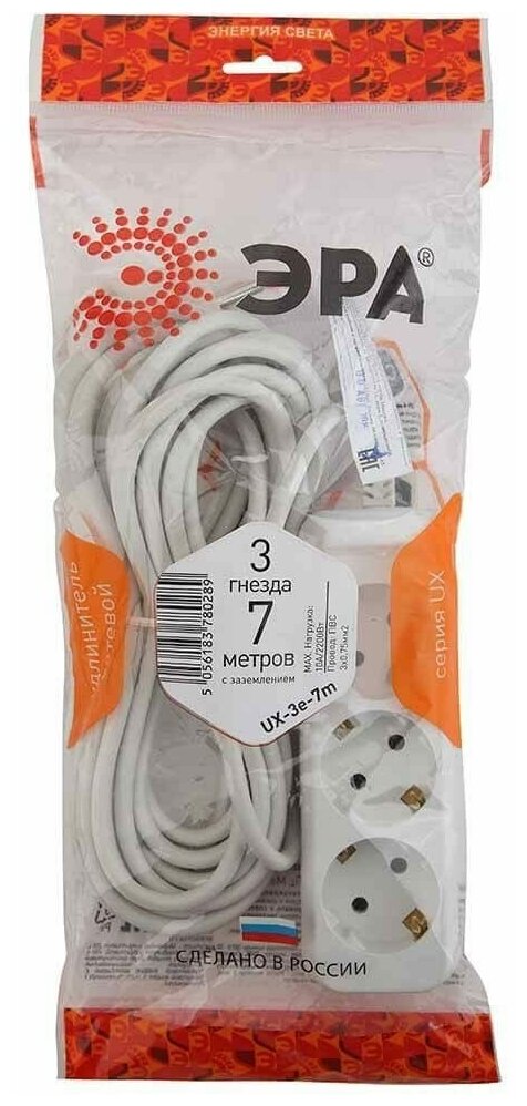 Отзывы на ЭРА сет. удл. ПВС 3х0.75 3 роз. 7 м 10А/2200Вт земля (корпус негорючий PP) UX-3е-7m (РФ) 0289