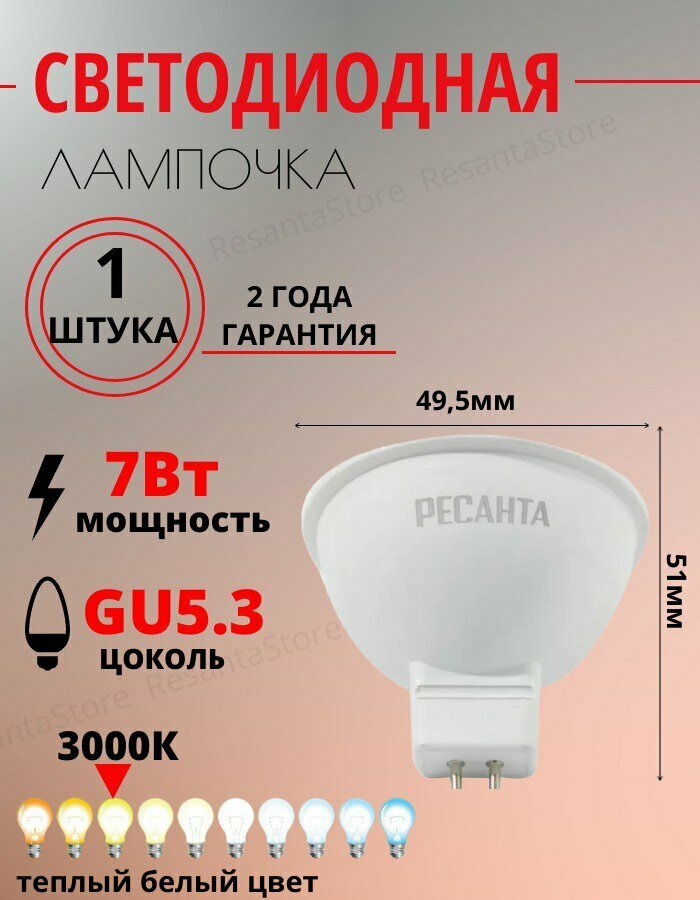 Рефлекторная светодиодная лампа Ресанта LL-R-MR16-7W-230-3K-GU5.3 информация: