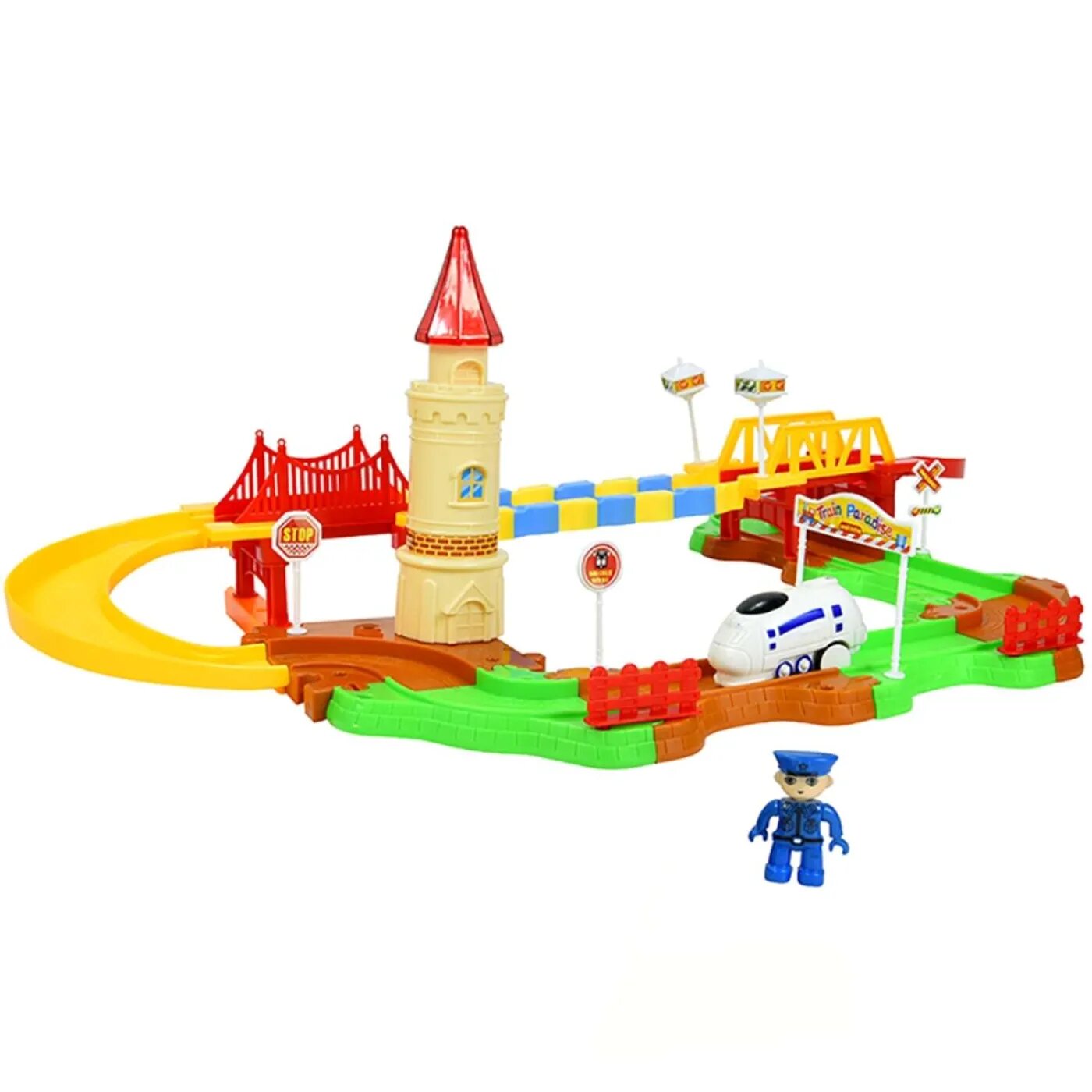 Игровой набор QI YUE "Железная дорога: Башня и большой мост" (35х46х18 см, 33 дет., подвижный поезд, аксессуары)