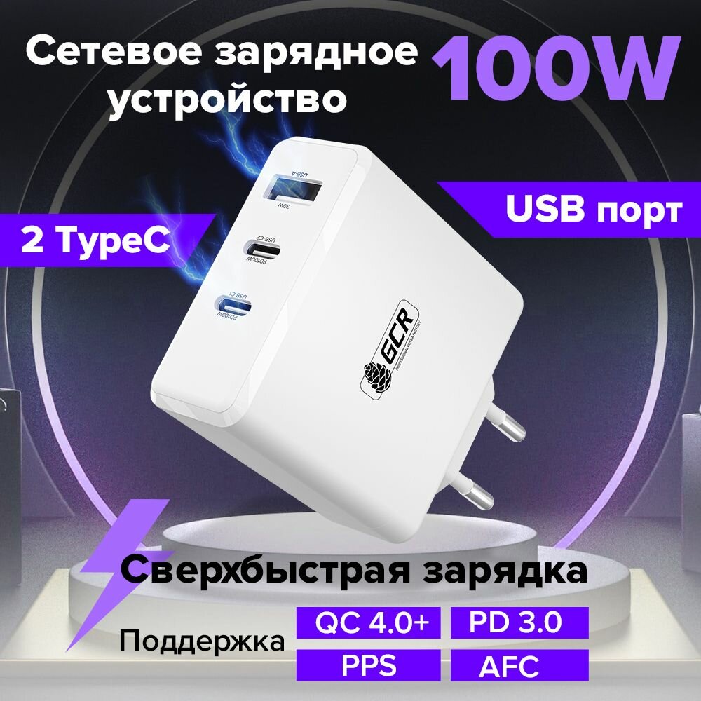 10 цен на GCR Сетевое зарядное устройство 100W, 1 USB + 2 TypeC, GaN Tech Quick Charger, PD 3.0, белый
