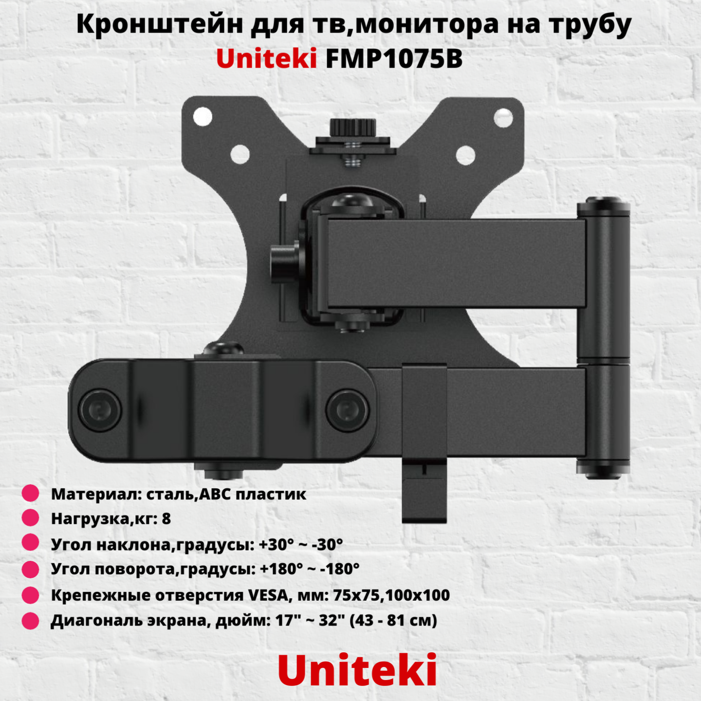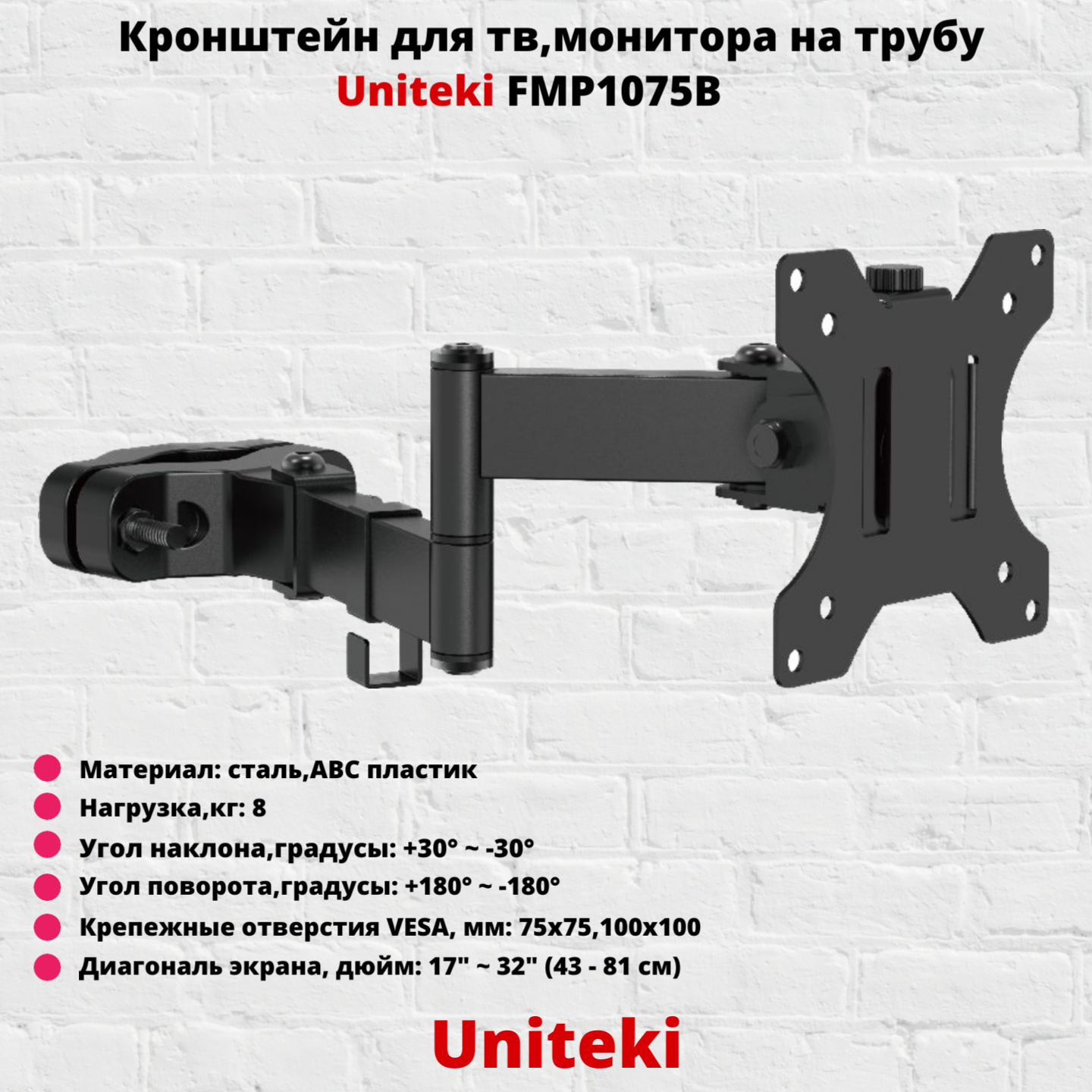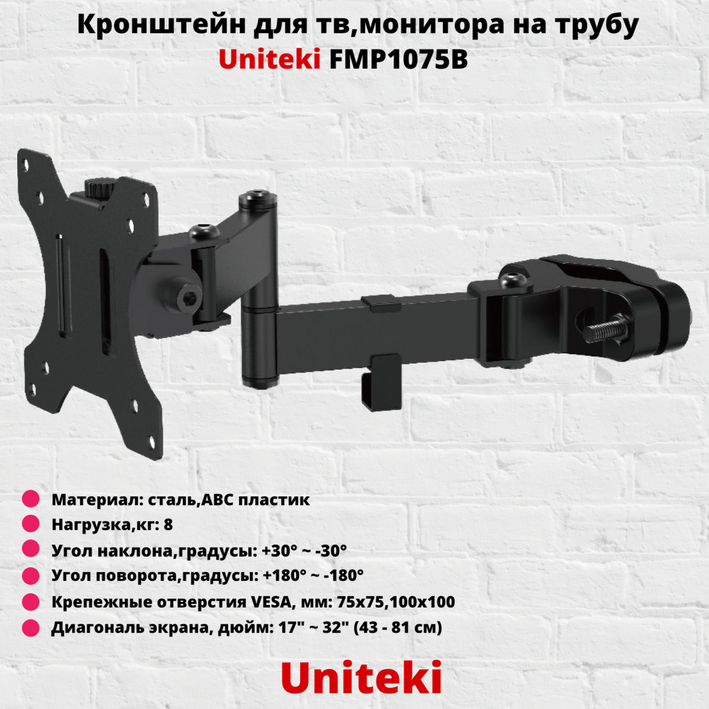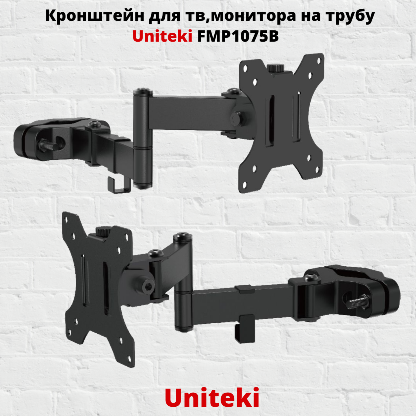 Кронштейн для монитора или телевизора с креплением на трубу наклонно-поворотный с диагональю от 17" до 32" UniTeki FMP1075, черный 2 590 ₽