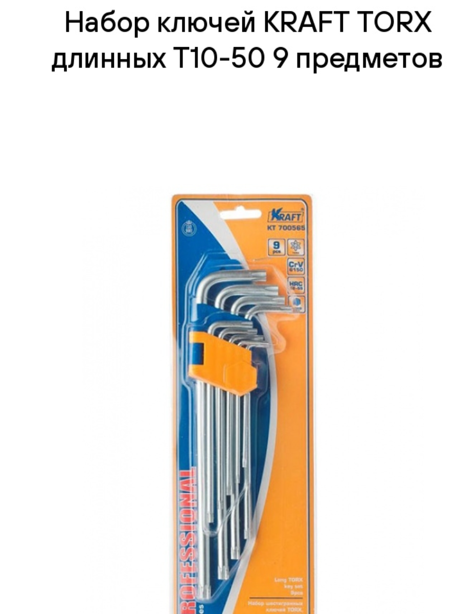 Ключи торцевые г-образные torx 9 предметов t10-t50 удлиненные kraft 700565 930 ₽