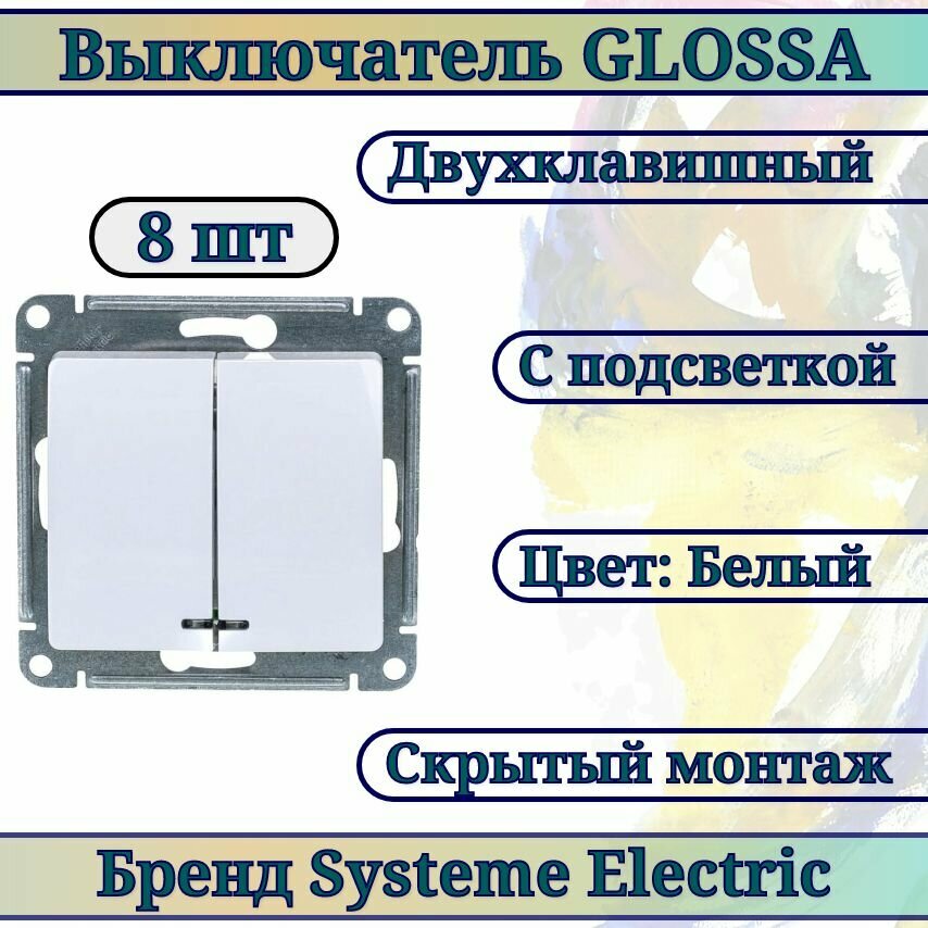 Выключатель двухклавишный белый / выключатель с подсветкой Glossa Systeme Electric GSL000153 8шт