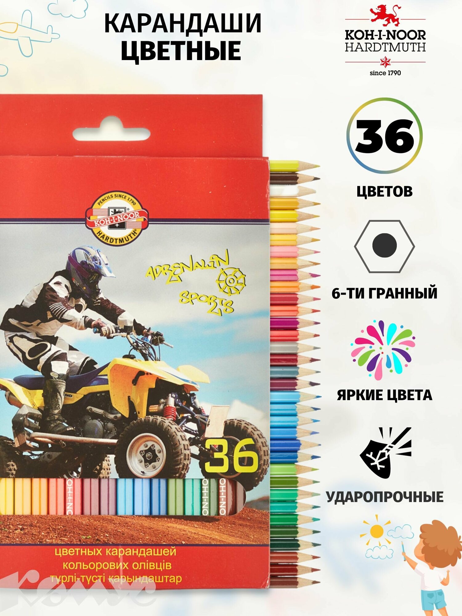Карандаши цветные 36 цветов Koh-I-Noor "Спорт" (L=175мм, D=6.9мм, d=2.8мм, 6гр) картонная упаковка (3555036007KSRU)