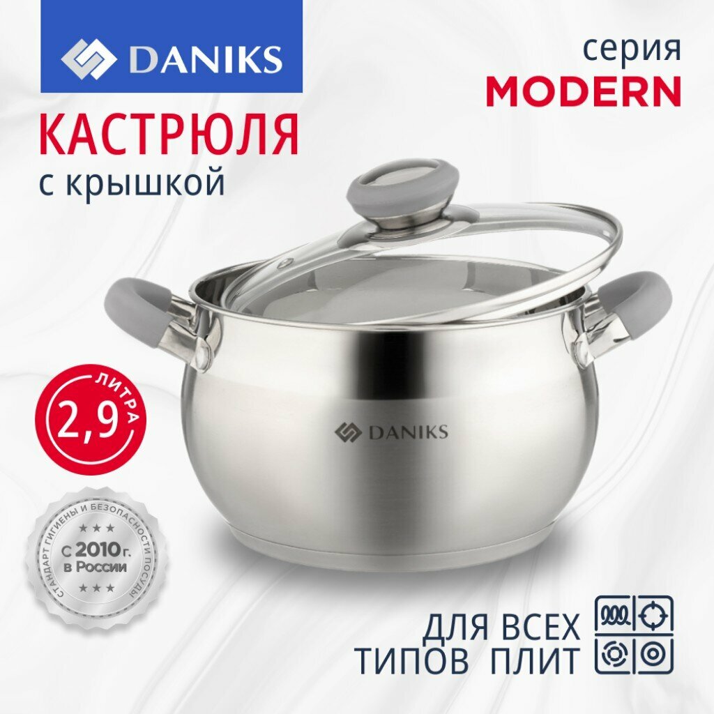 Отзывы на Кастрюля нержавеющая сталь, 2.9 л, с крышкой, крышка стекло, Daniks, Модерн серый, SD-18N, индукция