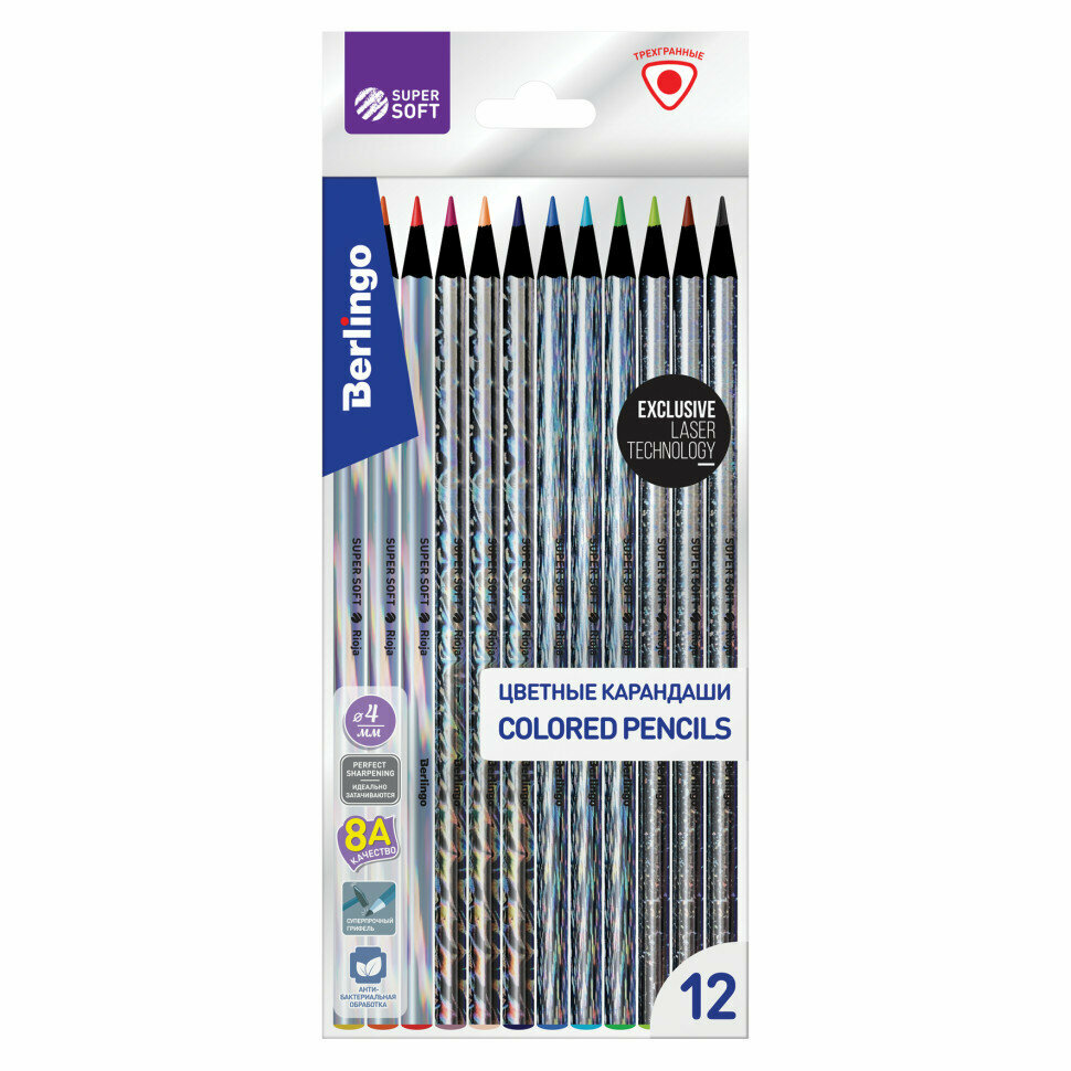 10 цен на Карандаши цветные Berlingo "SuperSoft. Starlight", 12цв., трехгран., черное дерево, лазерная пленка, заточен., европодвес, 320754