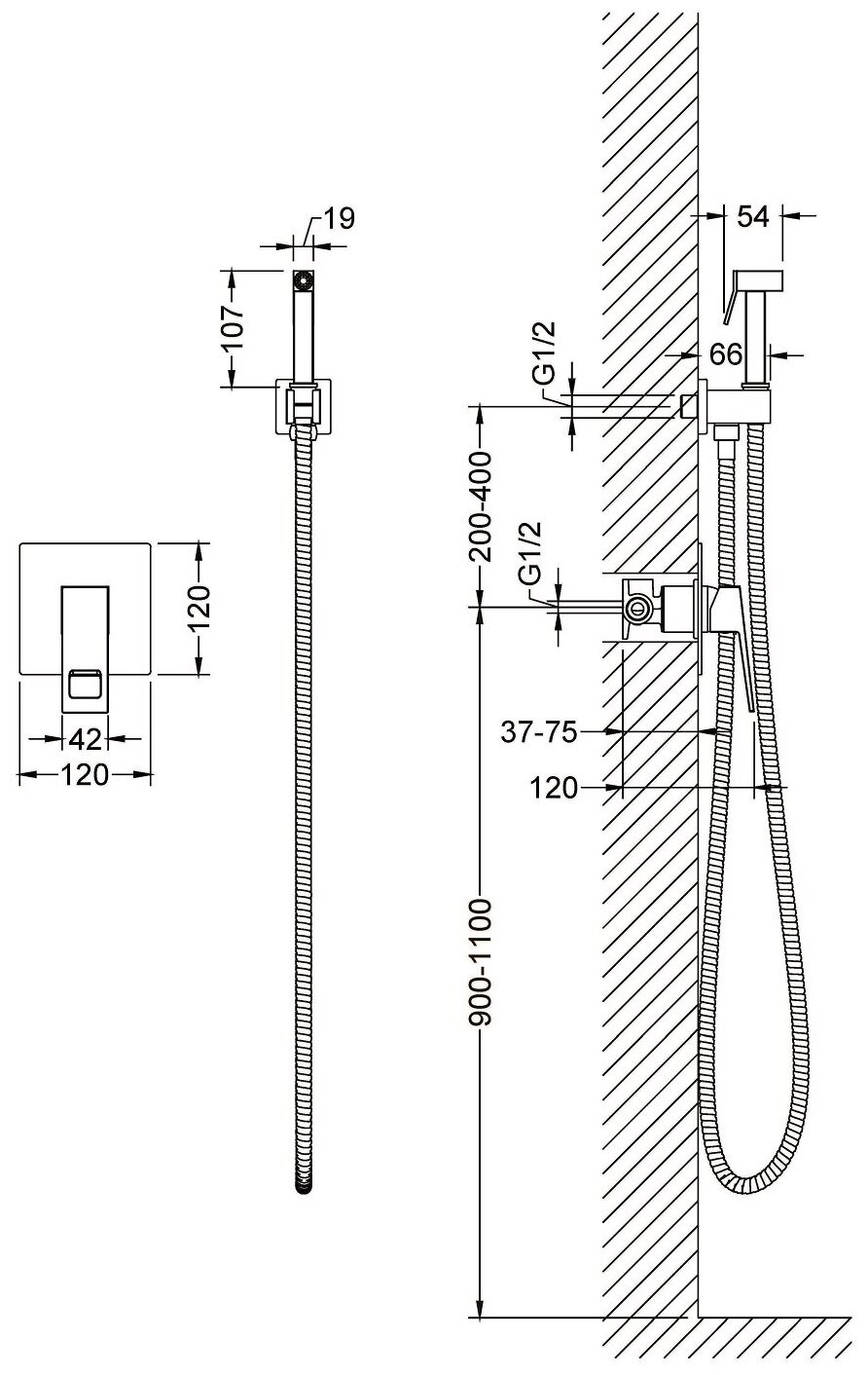 | Комплектация | Смеситель скрытого монтажа- 1 шт. Декоративная накладка смесителя (латунная) - 1 шт. Ручка управления смесителем - 1 шт. Шланг душа 1,2 м - 1 шт. Отвод из стены - держатель лейки (латунный) - 1 шт. Гигиеническая лейка (пластик) - 1 шт. Инструкция - 1 шт. |