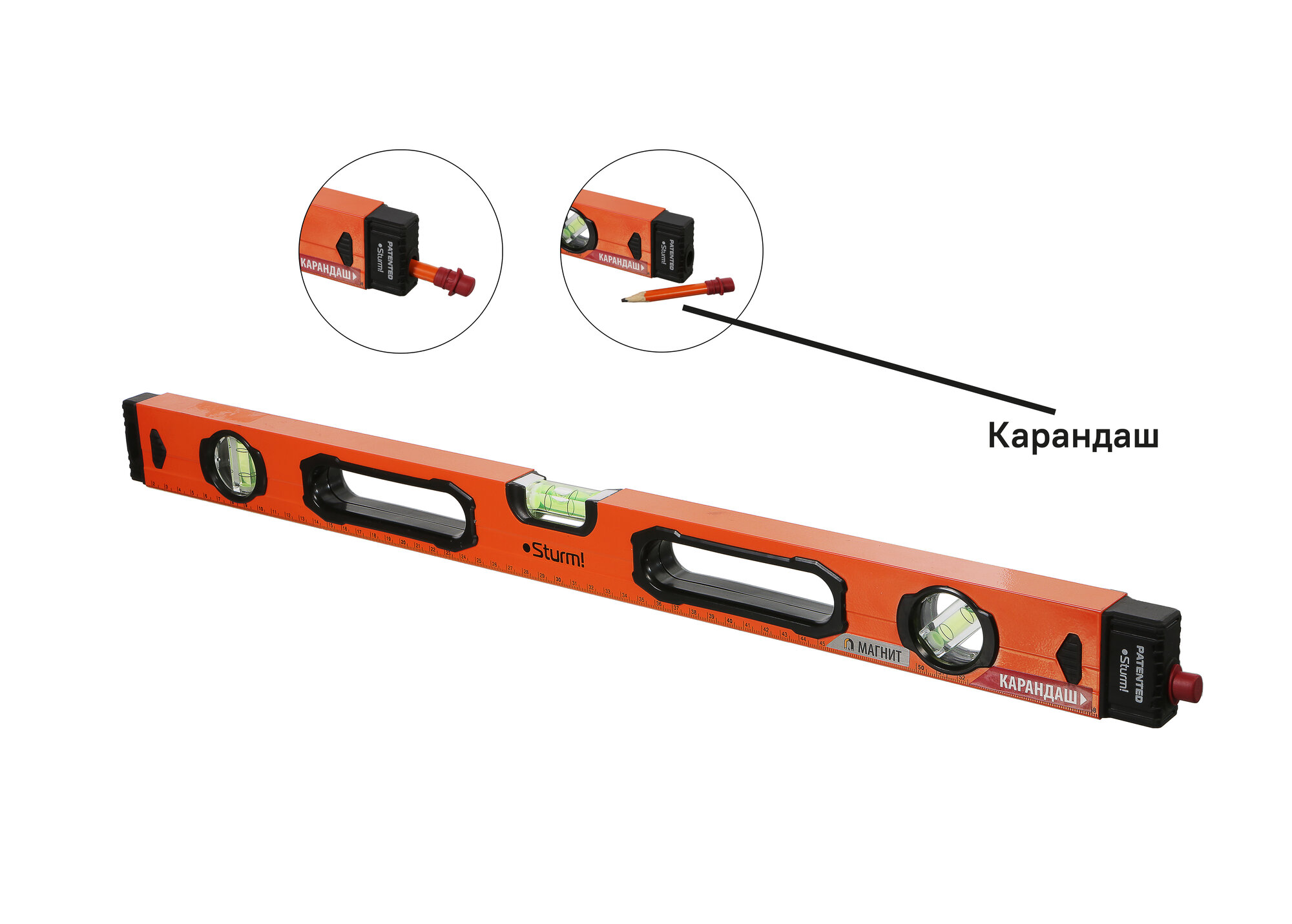 Уровень с карандашом 800 мм, магнитный,3 глазка,1мм/м, серия Кулибин, Sturm!