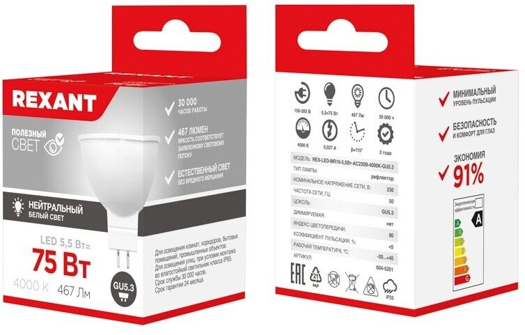 Лампа светодиодная Рефлектор 5,5Вт 467Лм GU5.3 4000K нейтральный свет REXANT 1 шт арт. 604-5201 информация:
