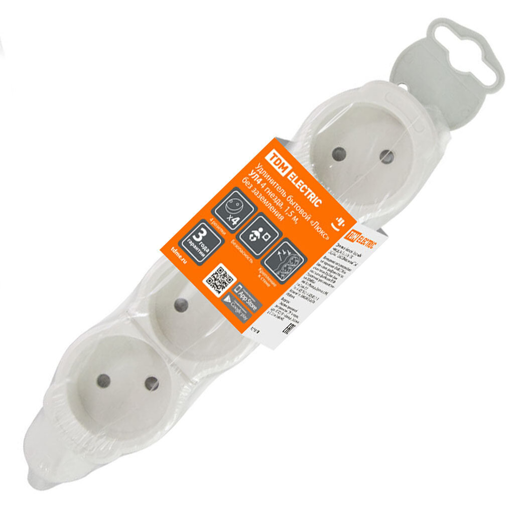 Удлинитель бытовой TDM Люкс УЛ4, 4 гнезда, без заземления, ПВС 2x0,75, бело-серый, 1,5м