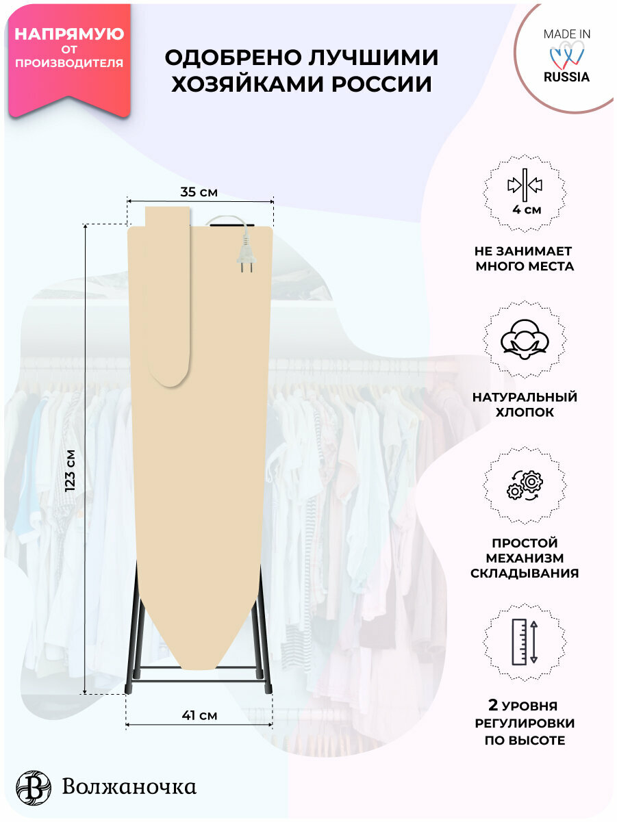 10 цен на Волжаночка Гладильная доска напольная с подрукавником, подставкой для утюга, розеткой и удлинителем, размер 115х35 см., цвет слоновая кость
