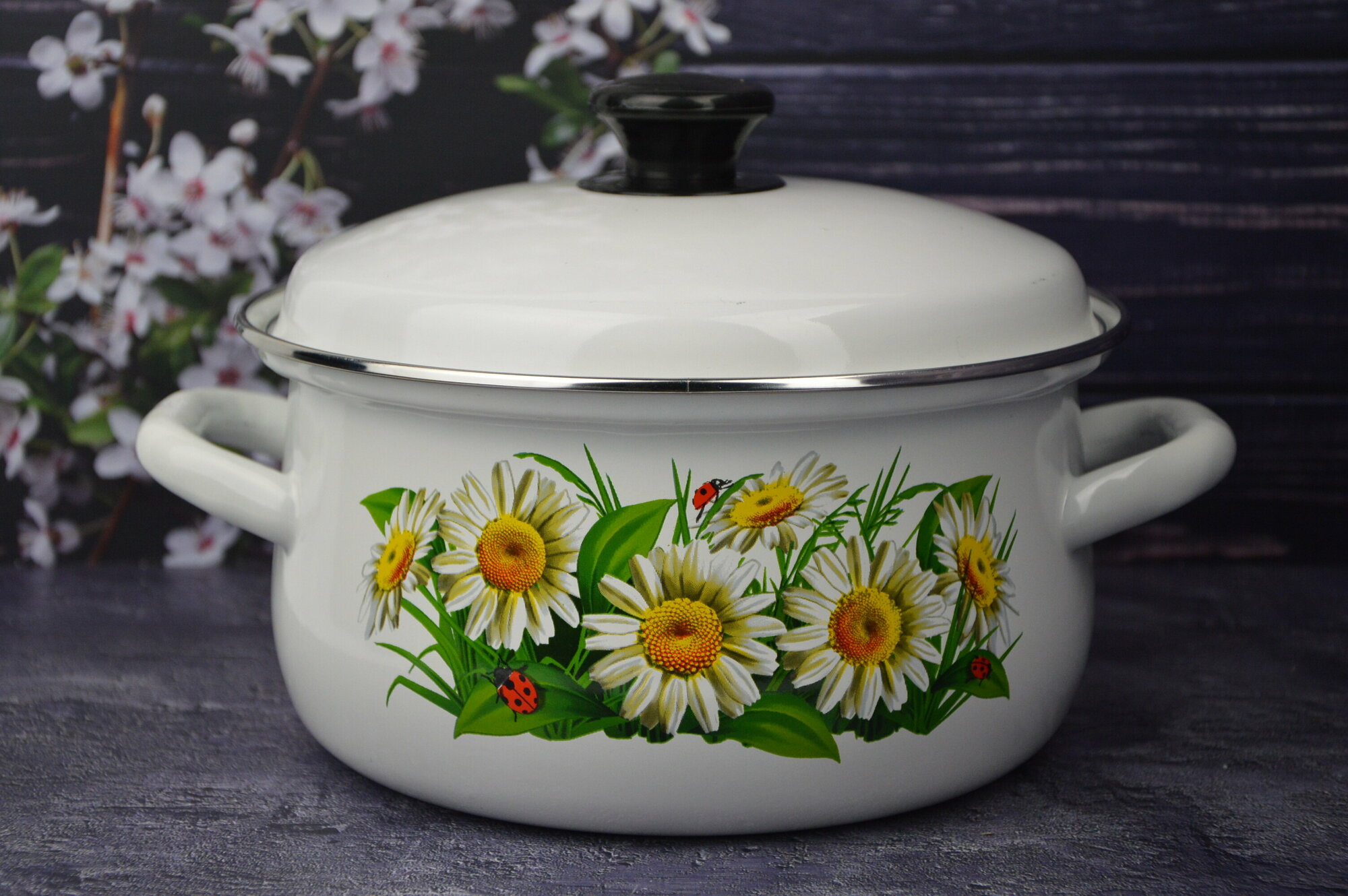 Кастрюля эмалированная 1,5 л с ободком белая с рисунком Фруктовая фантазия