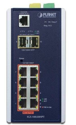 Управляемый коммутатор для рабочих групп Planet IP30 L2+ SNMP Manageable 8-Port Gigabit POE+(AT) Switch + 2-Port Gigabit SFP Industrial Switch (-40 to 75 C), ERPS Ring Supported, 1588