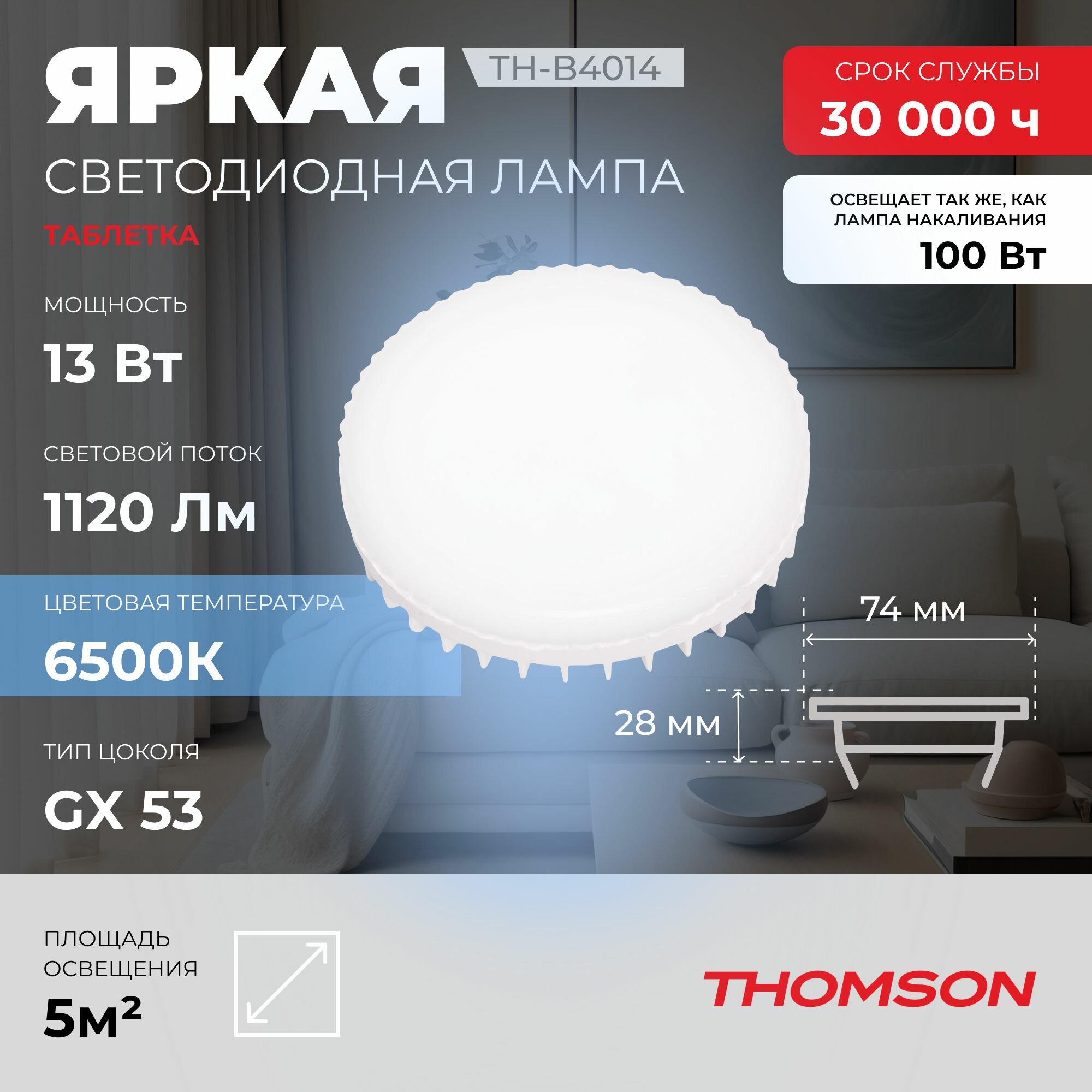 Лампочка Thomson TH-B4014 13 Вт, GX53, 6500K, таблетка, холодный белый свет информация: