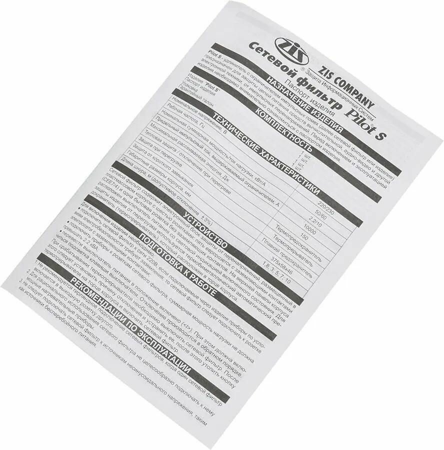 Сетевой фильтр Pilot S, 3м, белый [013] информация: