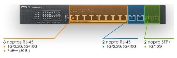 Коммутатор/ ZYXEL Hybrid Smart PoE ++ ZYXEL NebulaFlex XS1930-12HP switch, 19 "rack, 10xRJ-45: 1 / 2.5 / 5 / 10G (8 of