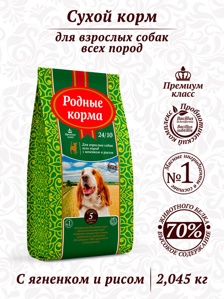 Cухой корм для взрослых собак ягненок с рисом, родные корма 23/10 5 русских фунтов 2,045 кг 1 169 ₽