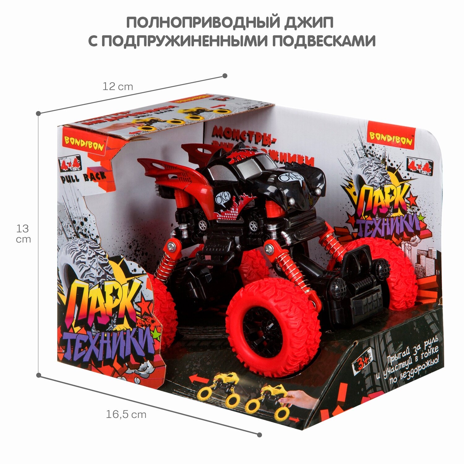 Инерц.(Pull back) пласт. джип 4WD на пружинной подвеске, Bondibon "Парк Техники", цвет чёрно-красный ВВ4573 информация: