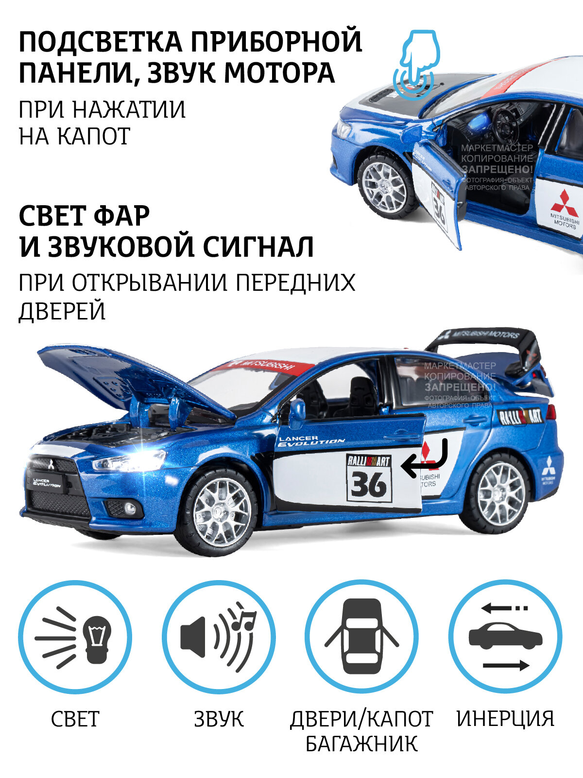 10 цен на ТМ "Автопанорама" Машинка металлическая1:32 Mitsubishi Lancer Evolution, синий, откр. двери, капот и багажник, свет, звук, инерция, в/к 17,5*13,5*9 см JB1251472