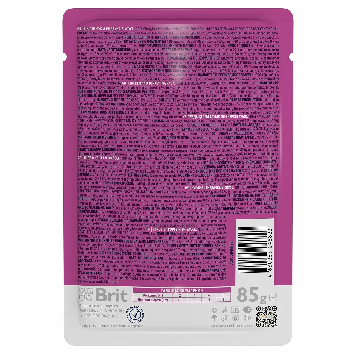 Brit: Premium, Пауч для взрослых кошек, Цыпленок и Индейка, в соусе, 85 гр.