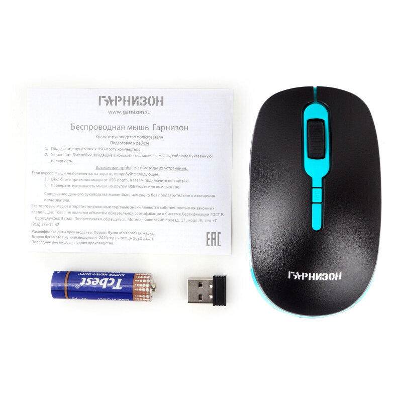 Комплект 6 штук, Мышь компьютерная Гарнизон GMW-460-1, WLS, черно-бирюз, 1600dpi (18842) 3 378 ₽