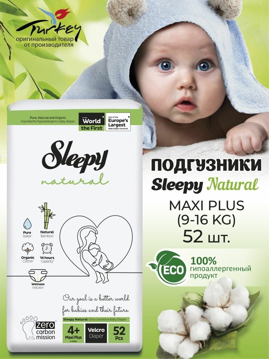 Подгузники детские Sleepy Natural р.4+ (9-16 кг) 52 шт информация: