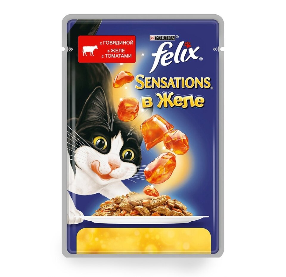 Влажный корм FELIX Sensations для взрослых кошек, с говядиной в желе с томатами, Пауч, 85 г, 24 шт