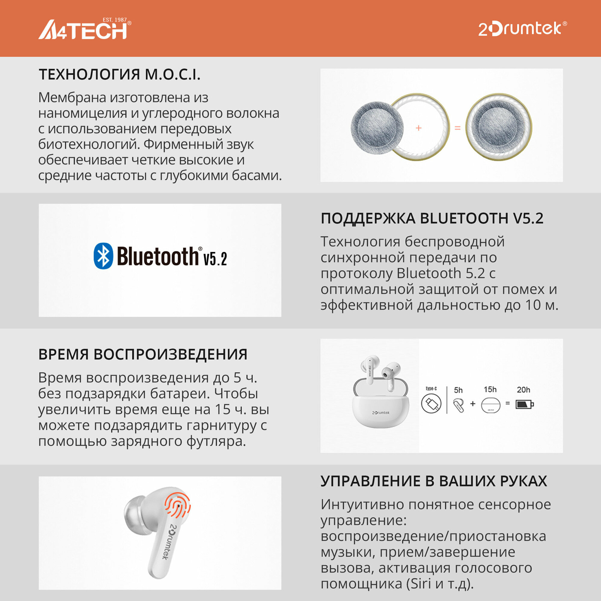 A4Tech 2Drumtek B25 TWS белый беспроводные bluetooth (B25 GRAYISH WHITE) 1 820 ₽