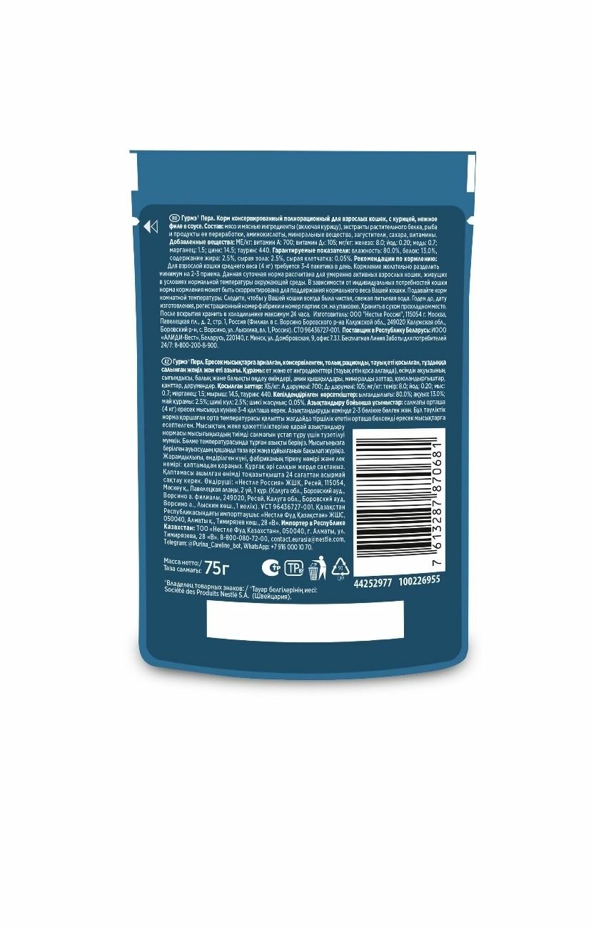Влажный корм 104 шт. для кошек Гурмэ курица в соусе (по 75 г) информация: