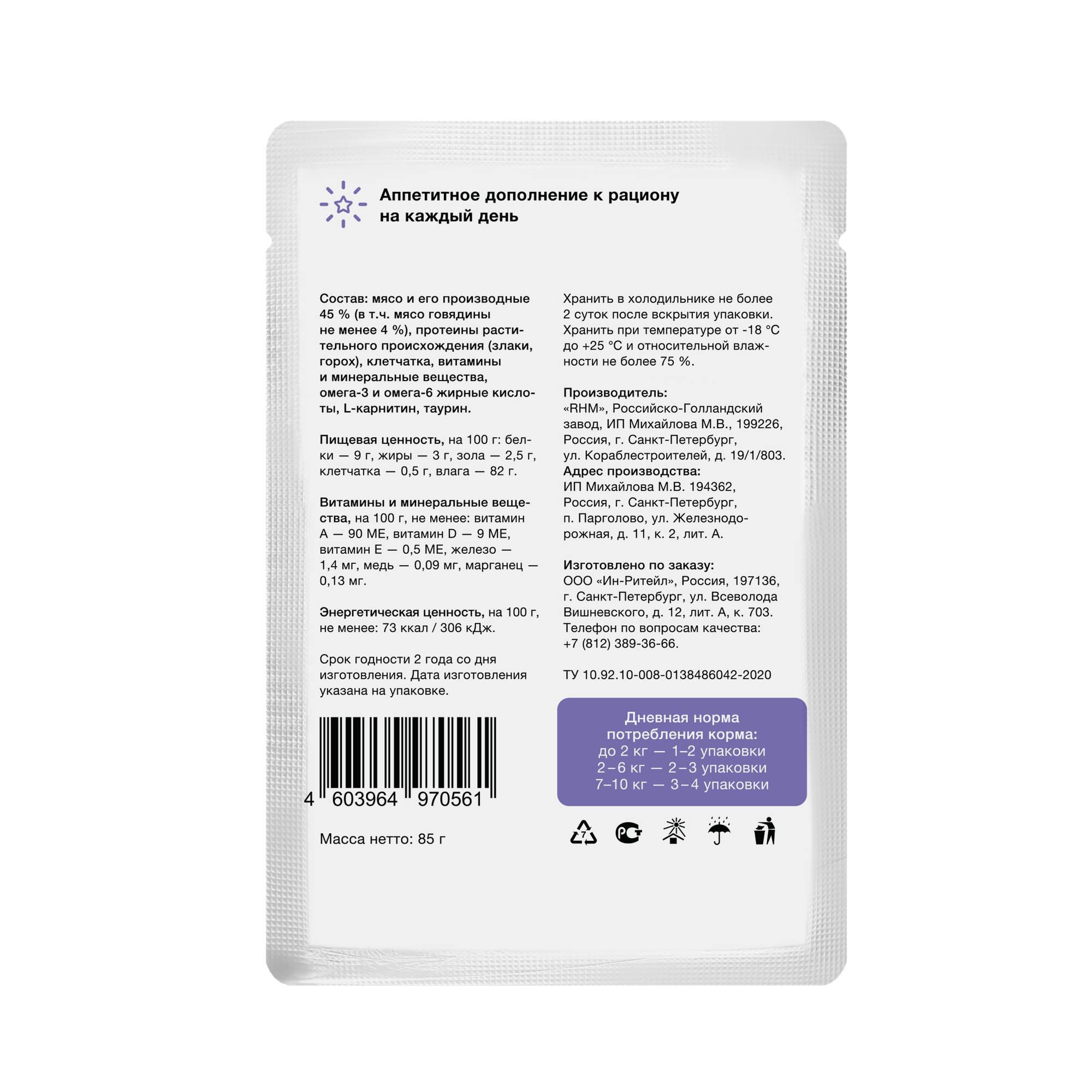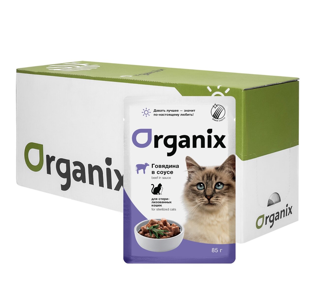 10 цен на ORGANIX корм влажный "Говядина в соусе" в паучах для стерилизованных кошек и кастрированных котов, 85 гр х 25 шт.