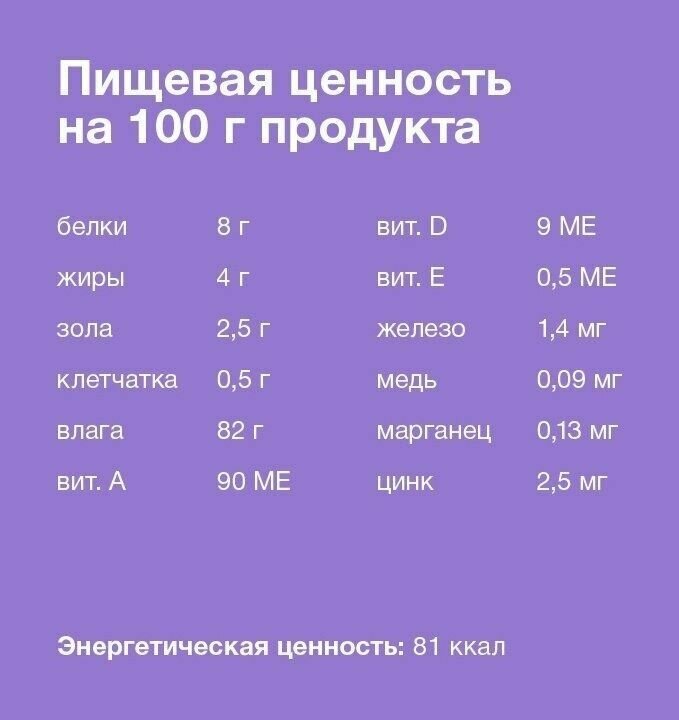 | Пищевая ценность | белки – 9 %, жиры – 3 %, зола – 2,5 %, клетчатка – 0,5 %, влажность – 82 % |