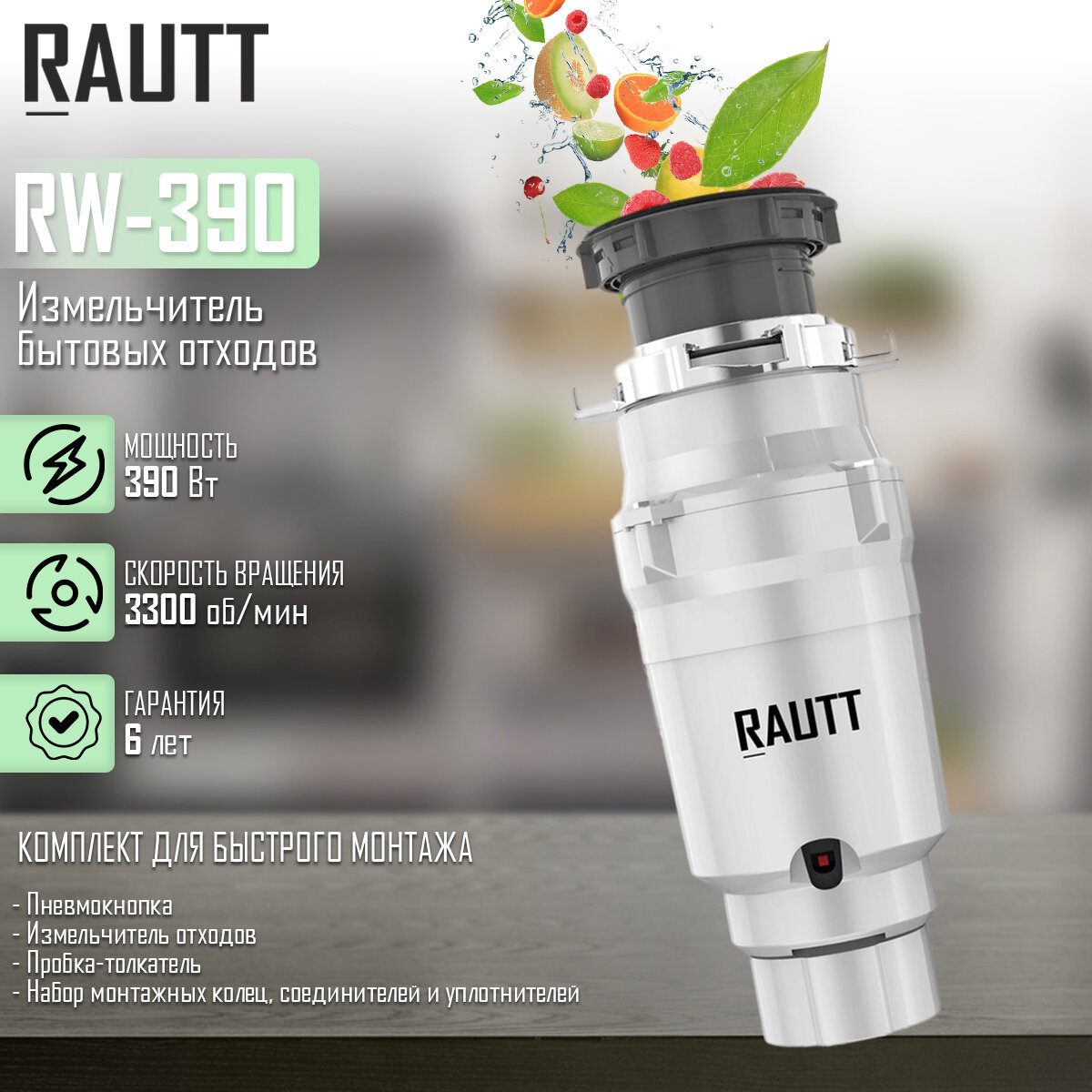 10 цен на Измельчитель бытовых отходов RAUTT, RW-390, электрический, встраиваемый, 390 Вт, 1500 мл, измельчитель пищевых отходов кухонный