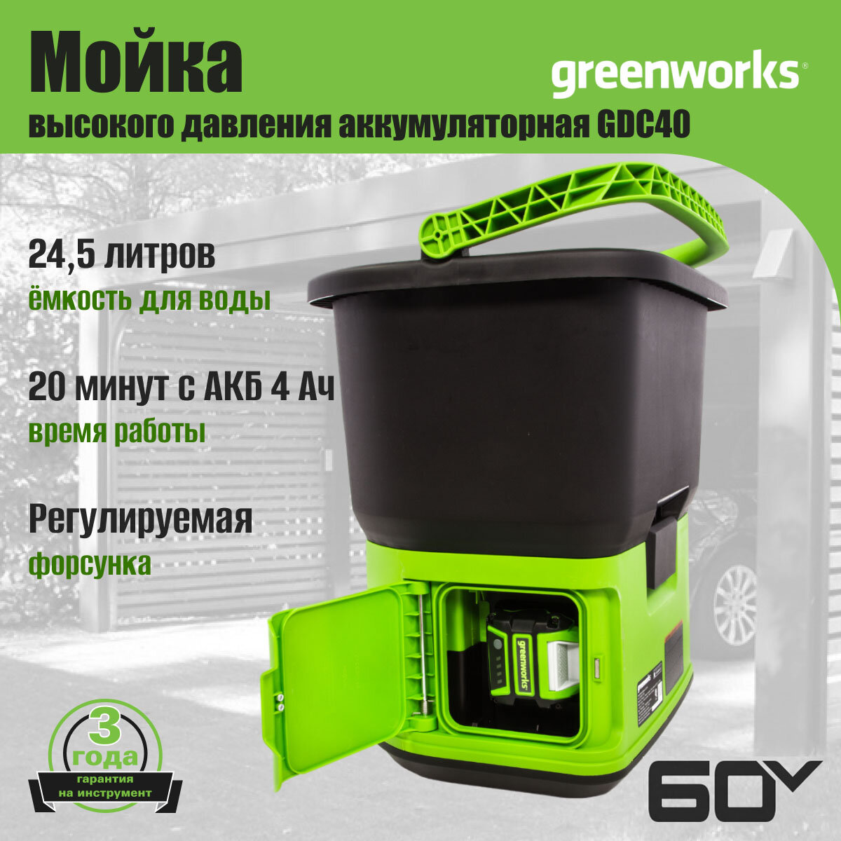 Мойка высокого давления аккумуляторная GDC60 GREENWORKS, 5104607