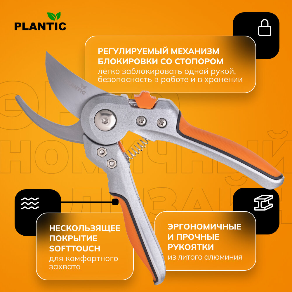Секатор плоскостной Plantic P202 25202-01, 21 см., лезвия из нержавеющей стали, ручка из алюминиевого сплава