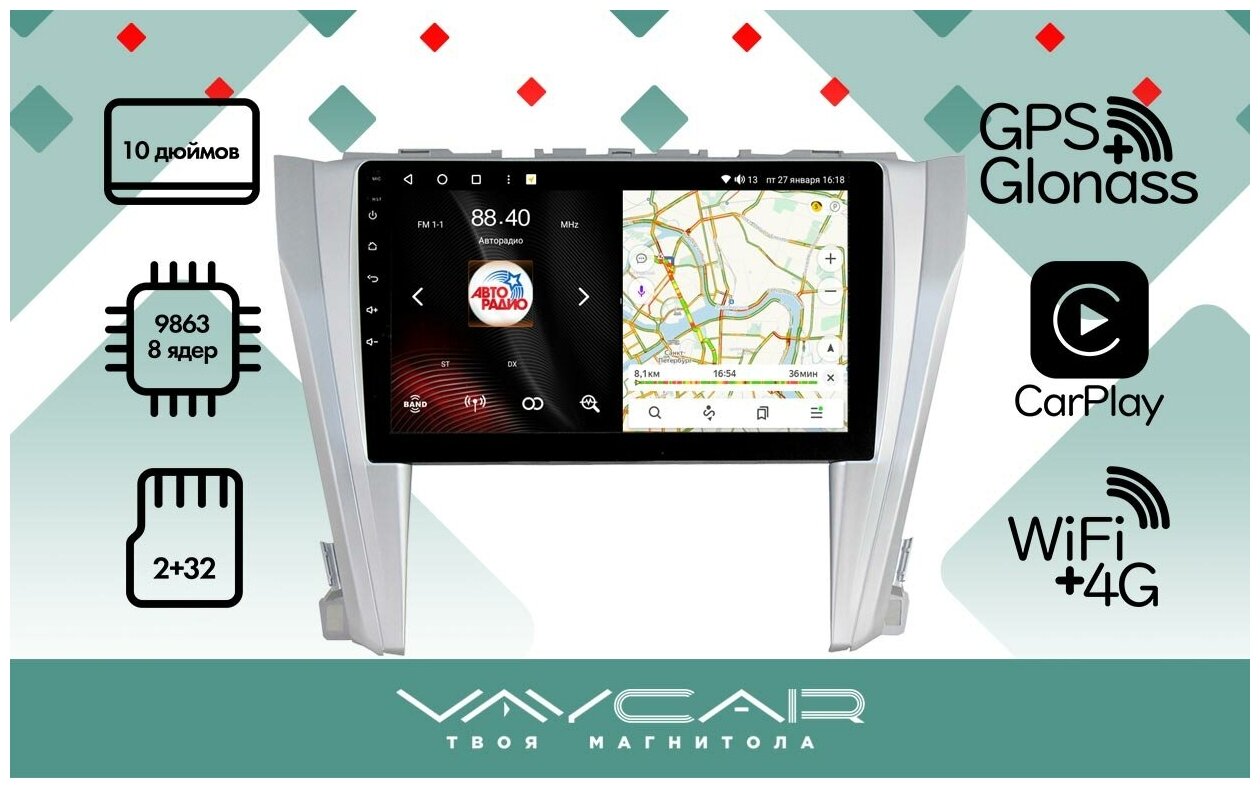 Магнитола Vaycar 10V2 для TOYOTA Camry V55 2015-2017 (Андроид, 2+32, 8 ядер, WiFi, BT, 4G, GPS, QLED 10") информация: