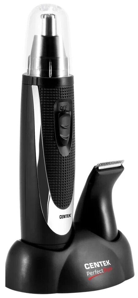 Centek Триммерный набор (чёрн/хром) 2 насадки для ушей и бороды, питание 1хАА, подставка CT-2177 .