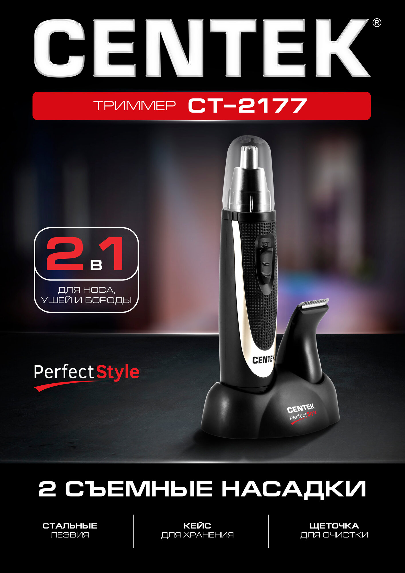 Триммер набор Centek CT-2177, 2 насадки для ушей и бороды, питание 1хАА, подставка, черный