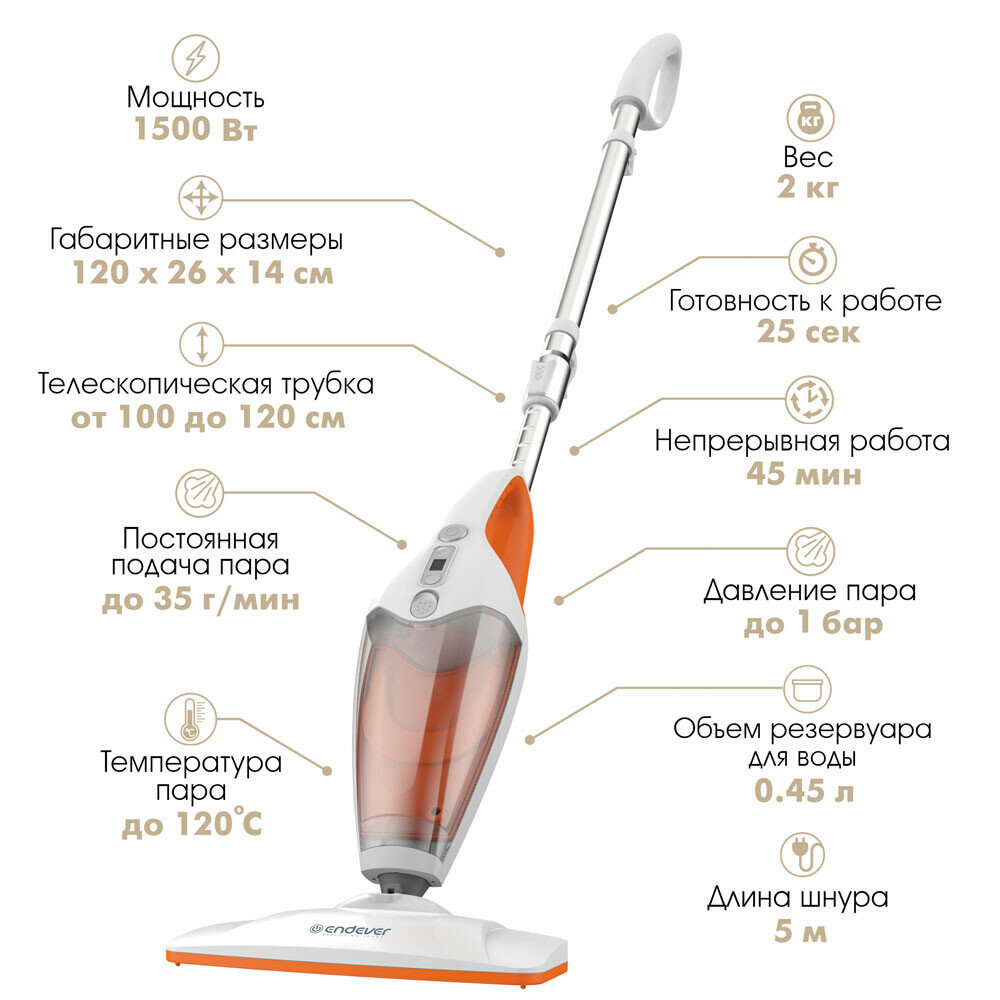 Паровая швабра ENDEVER Odyssey Q-622, белый/оранжевый цвет, 1500 Вт 90303