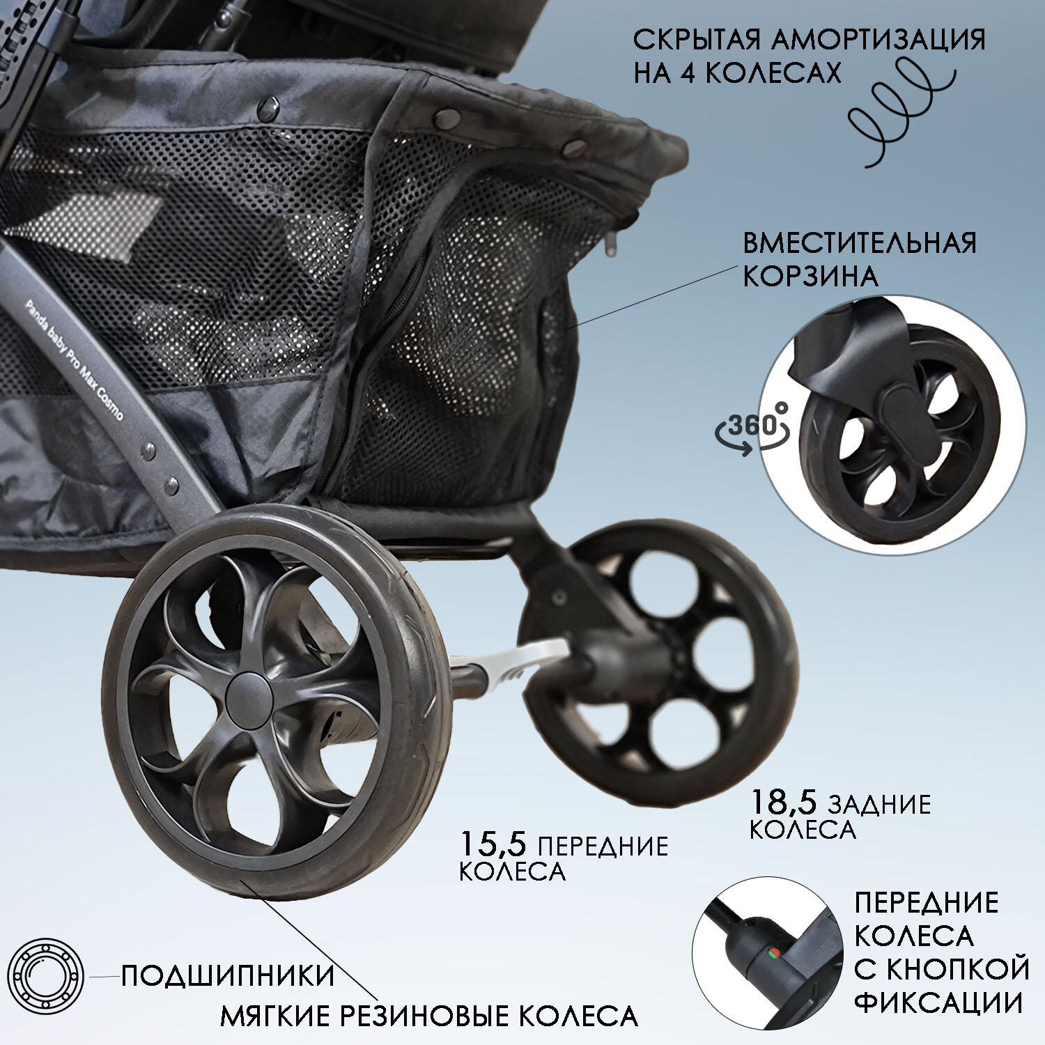 Детская прогулочная коляска с большими колесами и ручкой как в чемодане для путешествий до 4 лет Panda Baby Pro Max Cosmo Минни (чёрный) информация: