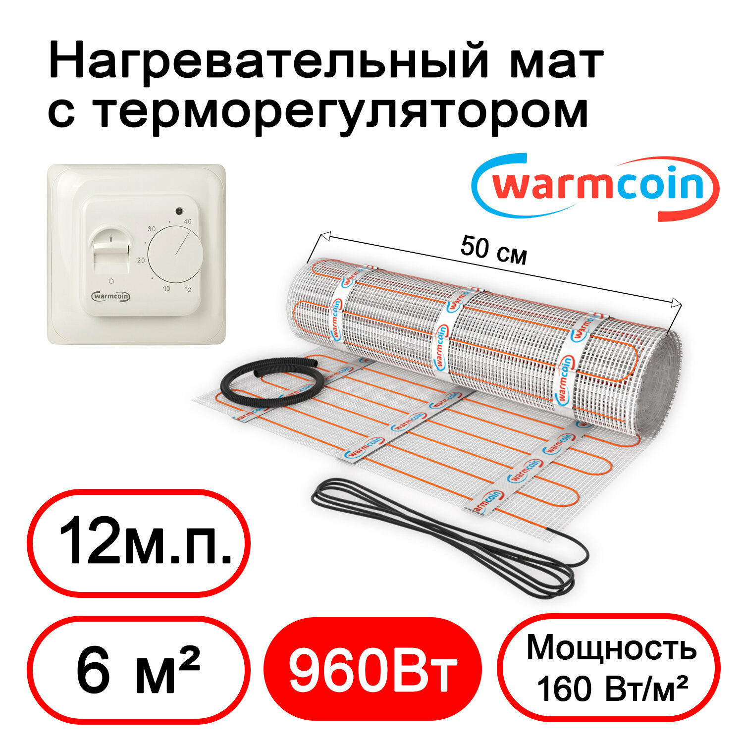 Теплый пол Warmcoin Экомат 6 м.кв. (0.5 х 12 м ) с термостатом