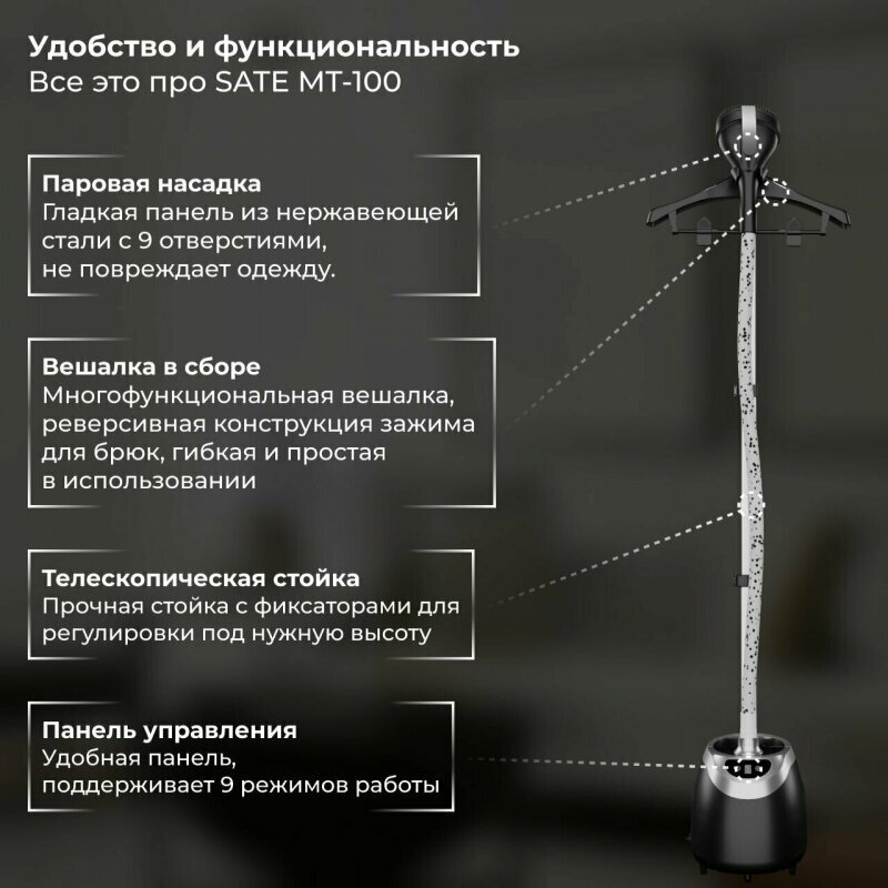 Напольный отпариватель для одежды вертикальный SATE MT-100/утюг и отпариватель/2000Вт, 1.5 л, плечики для одежды, черный информация: