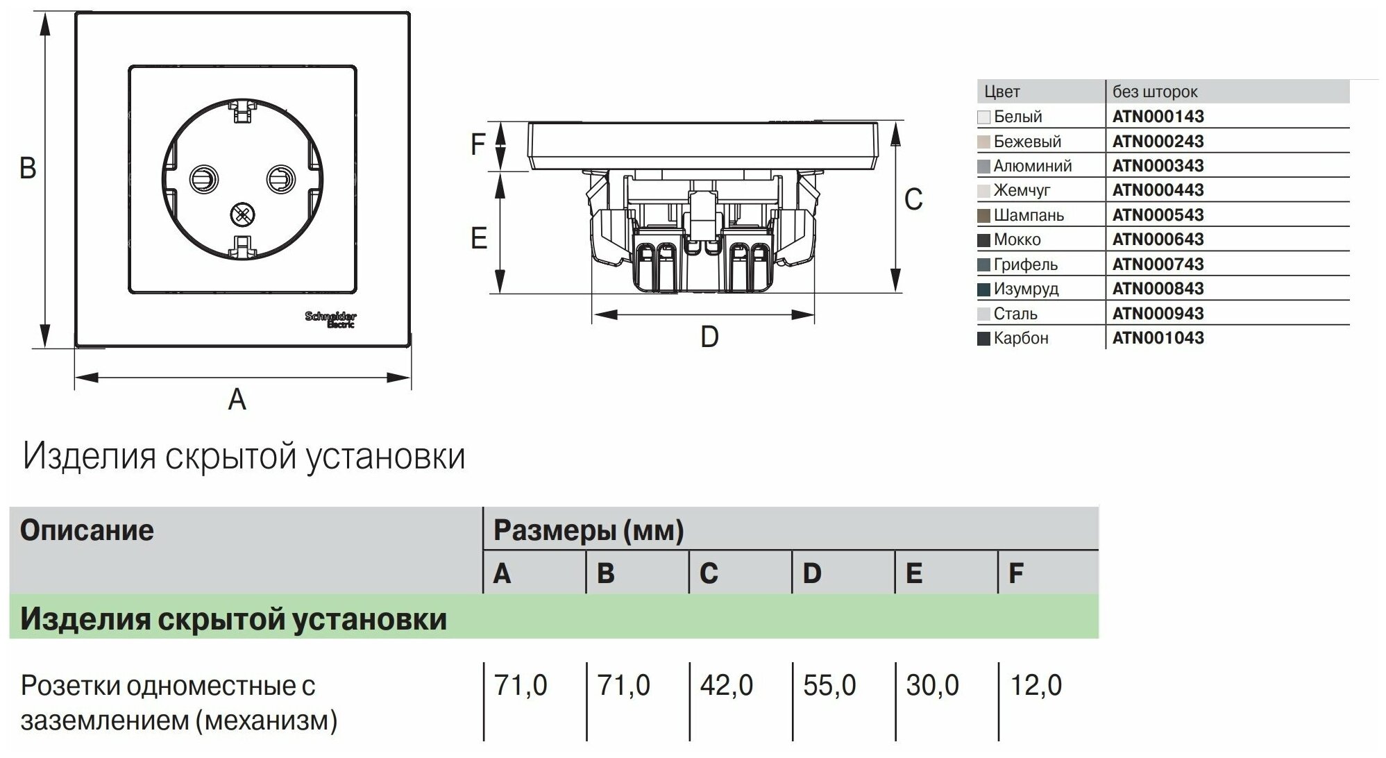 Розетка ATLASDESIGN, скрытый монтаж, с заземлением, карбон | код. ATN001043 | Schneider Electric (6шт. в упак.)